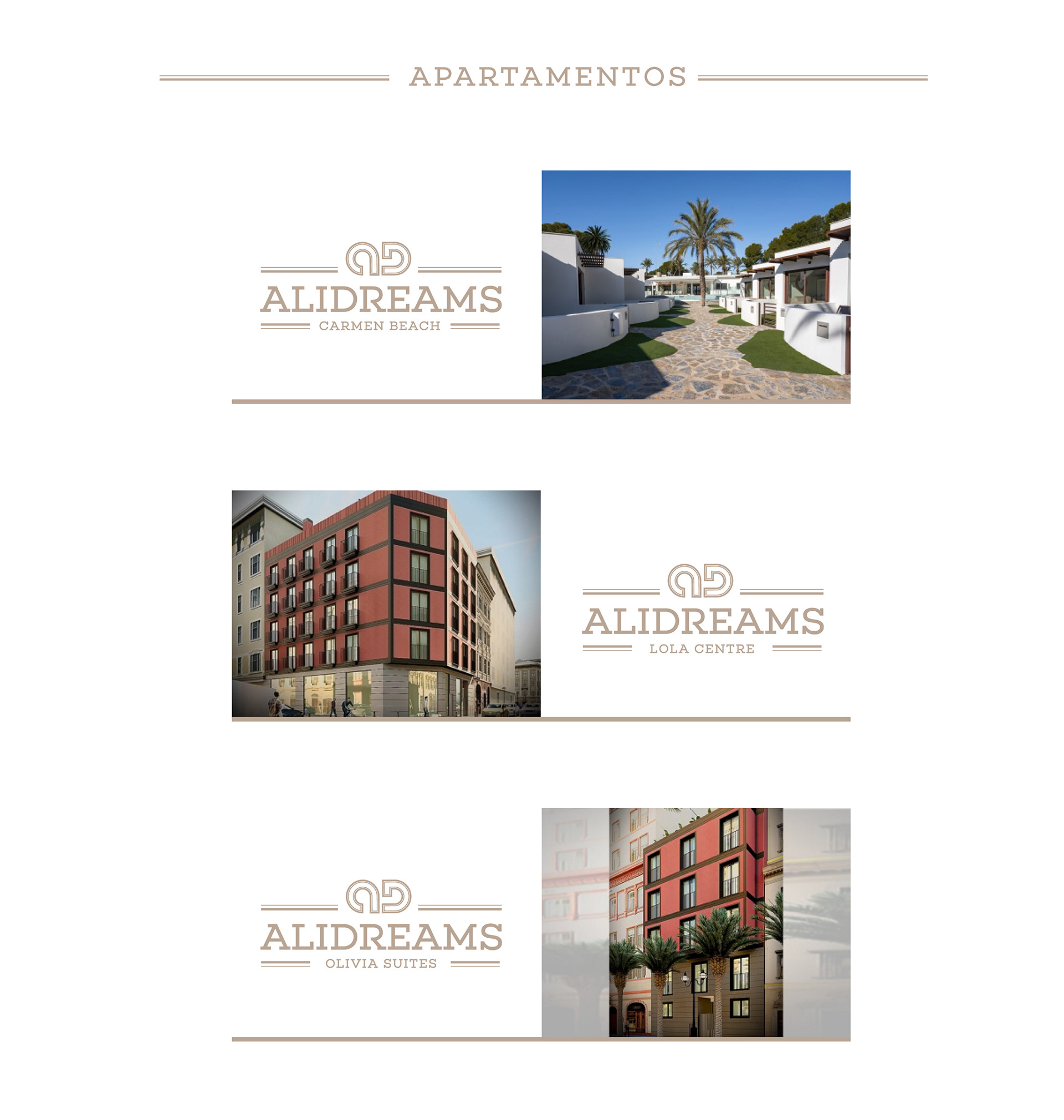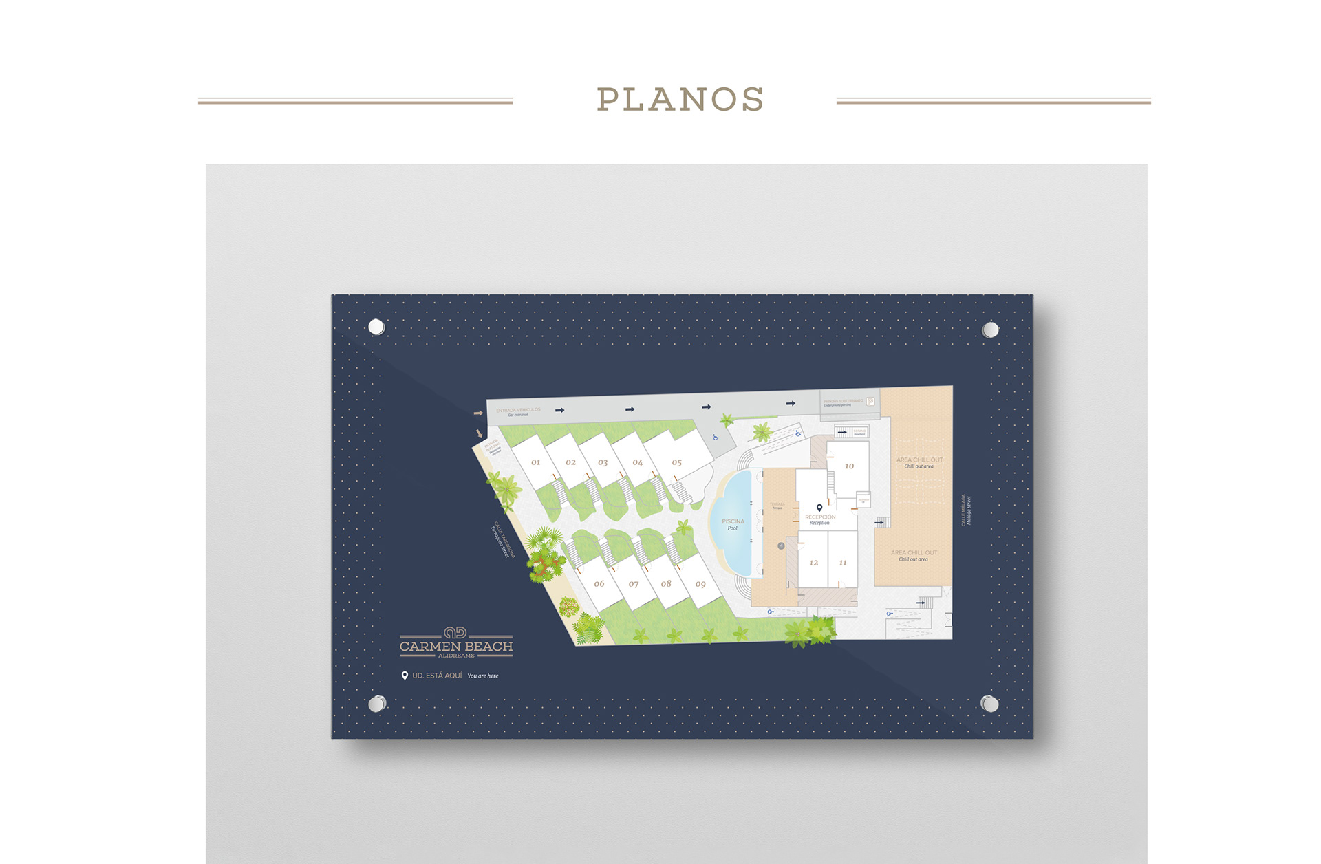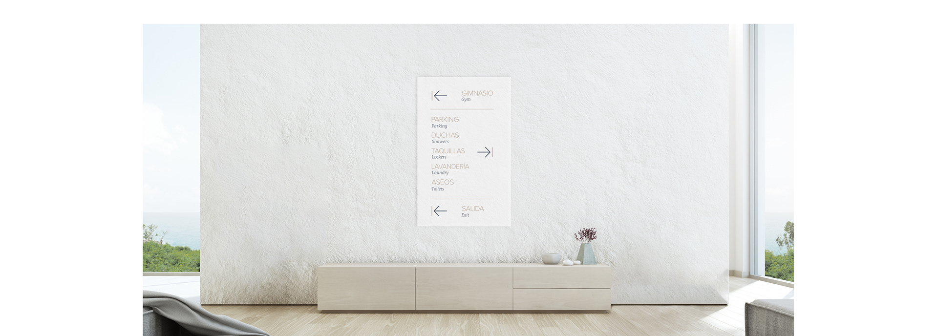 Creación de logotipo y señalética interior y exterior para complejo de apartamentos vacacionales de lujo en Alicante.
